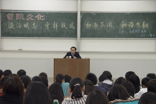 管院讲坛于 2009年3月24日晚上7:00在北区N4-JT04隆重开讲。管理学院院长王为一教授以管院院训“淡泊明志,宁静致远,和而不同,和谐共融”为主题做开坛第一讲。参加此次活动的有管理学院党委书记张弢博士、副书记朱艳阳博士、学生事务办公室主任张维功老师、团委书记王超老师、辅导员张刚老师以及管理学院团委学生会全体成员、社团联合会各部部长、党支部全体成员和各班主要班委。