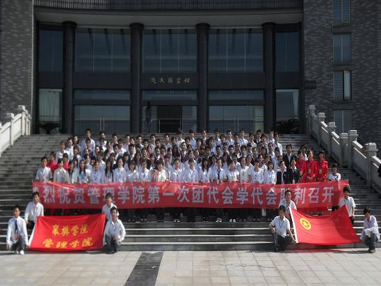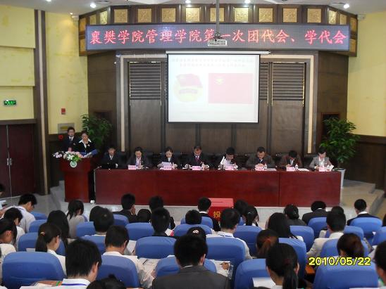 2010年5月22日下午两点,共青团襄樊学院管理学院第一届代表大会暨襄樊学院管理学院第一届学生代表大会在致远楼一楼报告厅举行。襄樊学院团委书记杨霄,襄樊学院管理学院党委副书记曹德勇,管理学院教研室主任龙玉萍,管理学院学工办王超、黄璞、刘蓓蓓、张刚等老师,以及来自管理学院各支部的团员代表、优秀青年学生代表,学生会部长,副部长,学生会岗位上工作过的团干部,学生干部共计130余人,出席了本次大会。