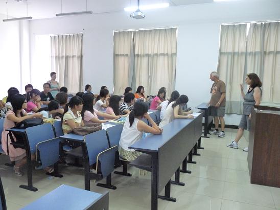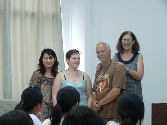 2010年6月13日上午,在我院担任07旅游管理专业旅游英语课程的外教Elyce Gobat 老师的父母来到我院,探访来华工作近一年的女儿。我院党委书记张弢、副书记曹德勇及张蕾老师等热情款待了Elyce一家人。
